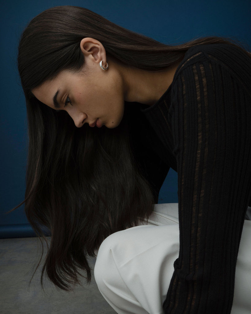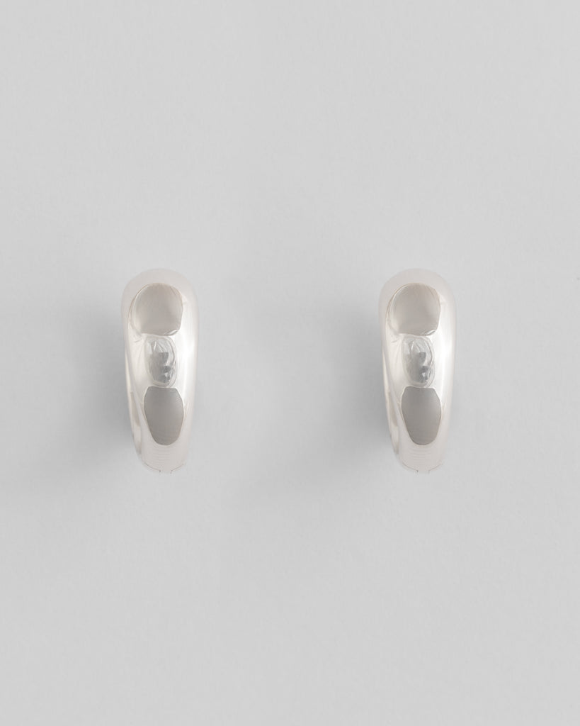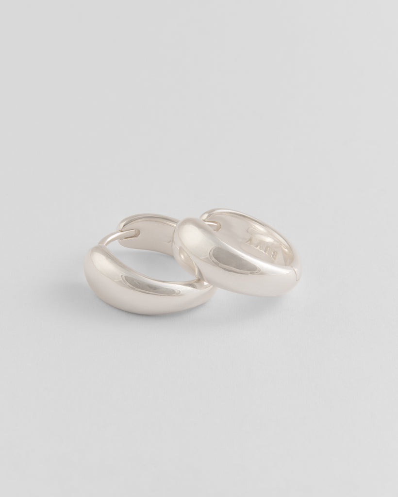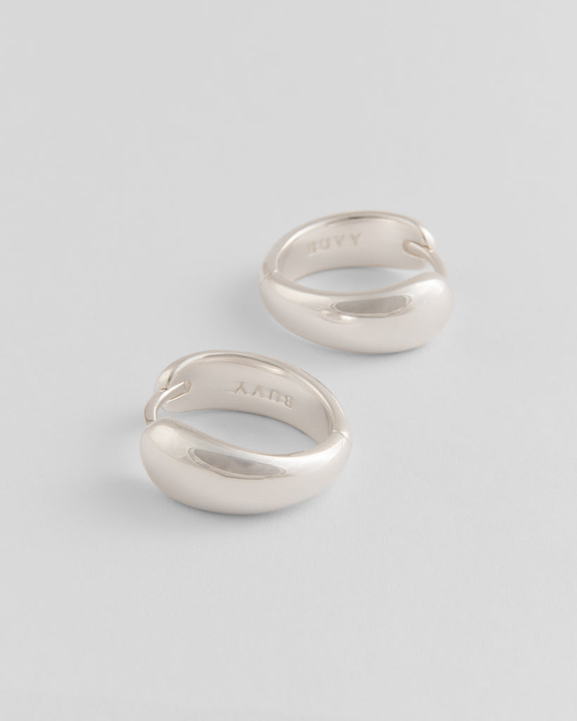 A nod to the ease and comfort of a classic huggie hoop, with a high-volume, bold formation. A tapered silhouette, featuring a hollowed, lightweight finish and latch clasp closure.